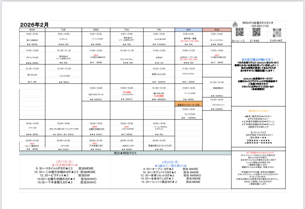 2月スケジュールが更新されました♡ 皆様の日頃のスケジュールにbreathに行く日を入れていきましょう💓💓 心地よい呼吸とデトックスを💓 予約はこちらHOT PEPPER Beauty 公式LINE友だち登録お願いします! お問い合わせ営業等はこちら 045-663-1132受付時間:9:30~16:30 \ Follow me!/